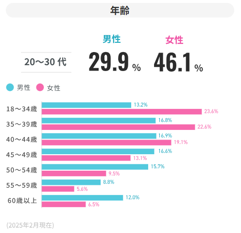 登録会員数は20代~40代の方が多く登録されていますが、50代以上での婚活も活発化してきています